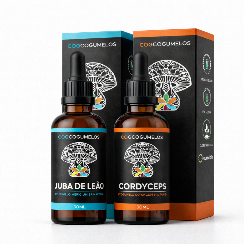 Cogumelos Hericium erinaceus e Cordyceps militaris (corpo frutífero) em solução hidroalcoólica (20 a 30%).