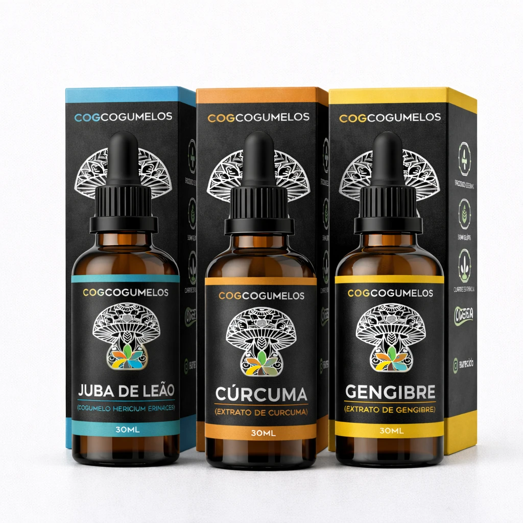 O Nero Blend da COG é uma seleção técnica que reúne a complexidade do reino fúngico com a tradição das especiarias botânicas. Este conjunto apresenta três extratos puros (Hericium erinaceus, Curcuma longa e Zingiber officinale), selecionados por sua origem rastreável e perfis sensoriais distintos, desenvolvidos para integrar ingredientes de alta pureza à rotina alimentar contemporânea.
