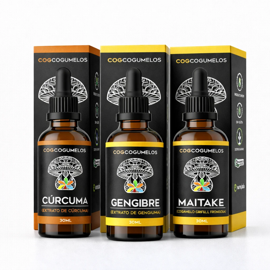 • Trio de extratos de cogumelos (Cúrcuma, Gengibre e Maitake)